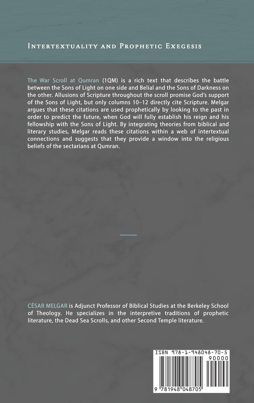 The War Scroll at Qumran (1QM) is a rich text that describes the battle between the Sons of Light on one side and Belial and the Sons of Darkness on the other. Allusions of Scripture throughout the scroll promise God’s support of the Sons of Light, but only columns 10–12 directly cite Scripture. Melgar argues that these citations are used prophetically by looking to the past in order to predict the future, when God will fully establish his reign and his fellowship with the Sons of Light. By integrating theories from biblical and literary studies, Melgar reads these citations within a web of intertextual connections and suggests that they provide a window into the religious beliefs of the sectarians at Qumran.