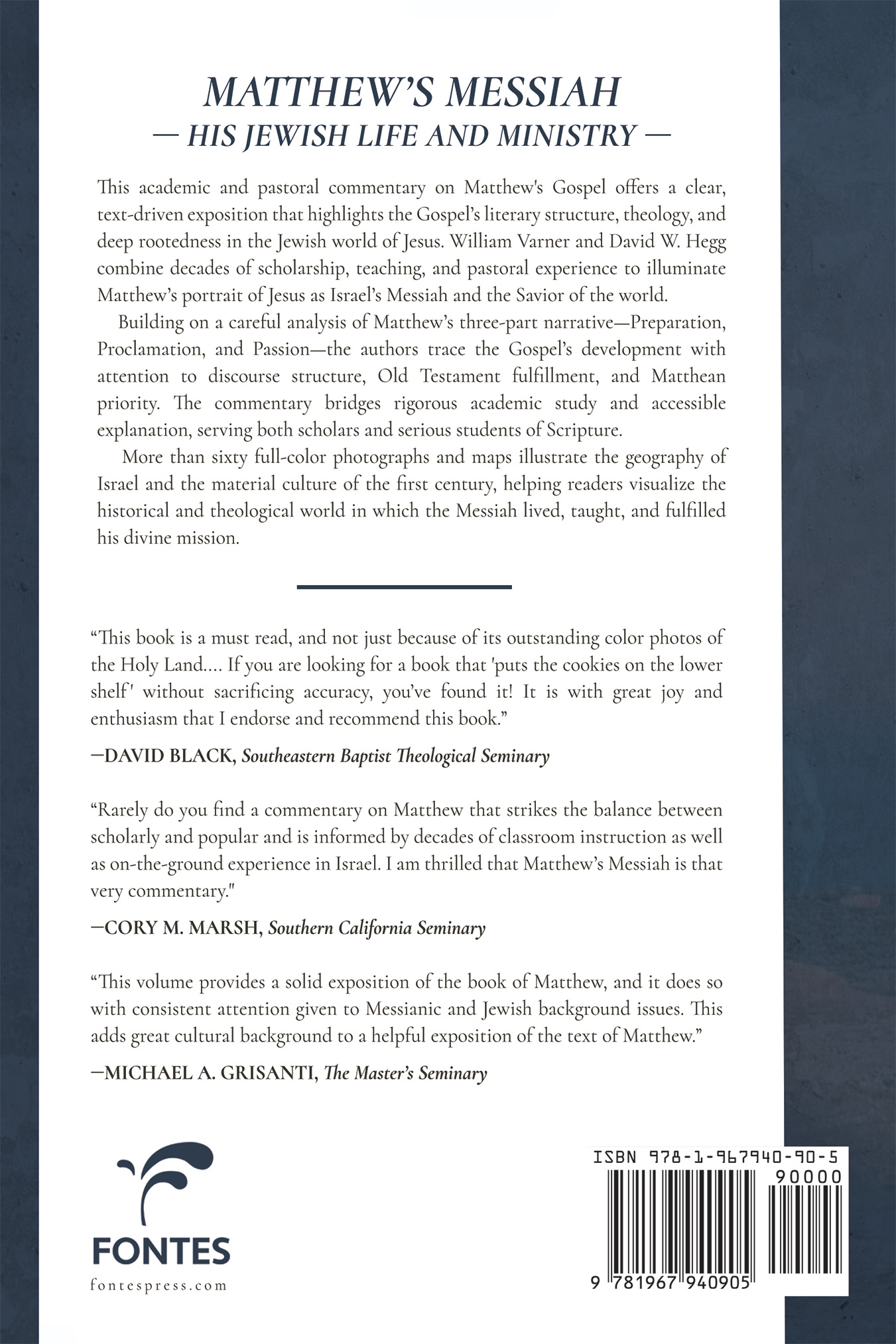 “Rarely do you find a commentary on Matthew that strikes the balance between scholarly and popular and is informed by decades of classroom instruction as well as on-the-ground experience in Israel. I am thrilled that Matthew’s Messiah is that very commentary. With careful exegesis and application of modern linguistics, on top of leading more than a fifty study trips to Israel and publishing multiple volumes on the life of the Messiah, I can say with confidence that no one I know surpasses Will Varner’s wisdom, experience, and skill in handling the text of Matthew. Both academics and lay people will find this work insightful, bolstered by David Hegg’s perceptive exposition of Mathew’s five discourses and Todd Bolen’s illuminating photos for relevant portions of the text. Most refreshing is the careful attention paid to Matthew’s uniquely Jewish context and chronological priority over the other Gospels when so many commentators capitulate to critical source theories or reconstructions of the text that stifle Matthew’s clear Jewishness. I cannot recommend this commentary more highly!”