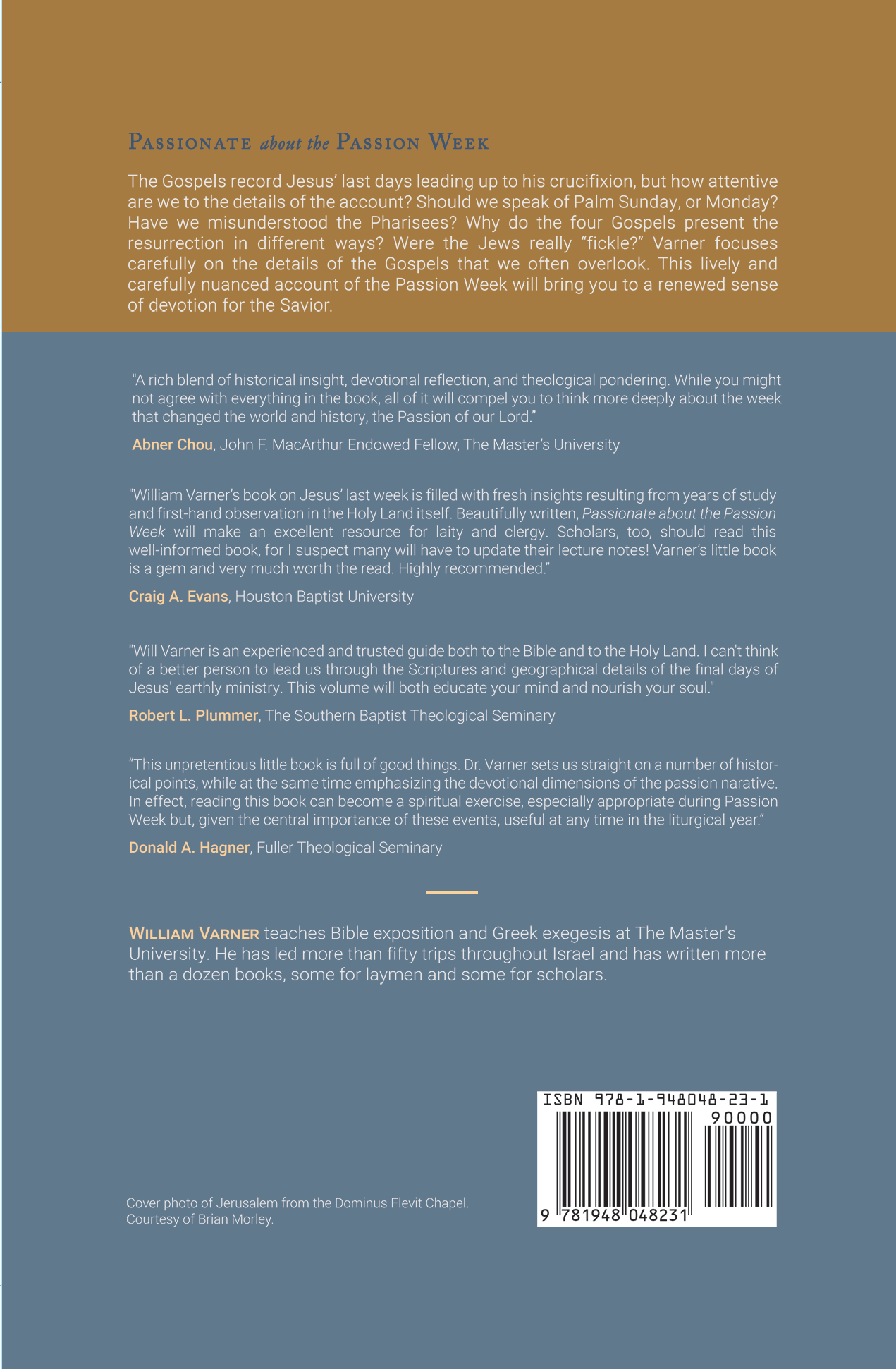 “William Varner’s book on Jesus’ last week is filled with fresh insights resulting from years of study and first-hand observation in the Holy Land itself. Beautifully written, Passionate about the Passion Week will make an excellent resource for laity and clergy. Scholars, too, should read this well-informed book, for I suspect many will have to update their lecture notes! Varner’s little book is a gem and very much worth the read. Highly recommended.”